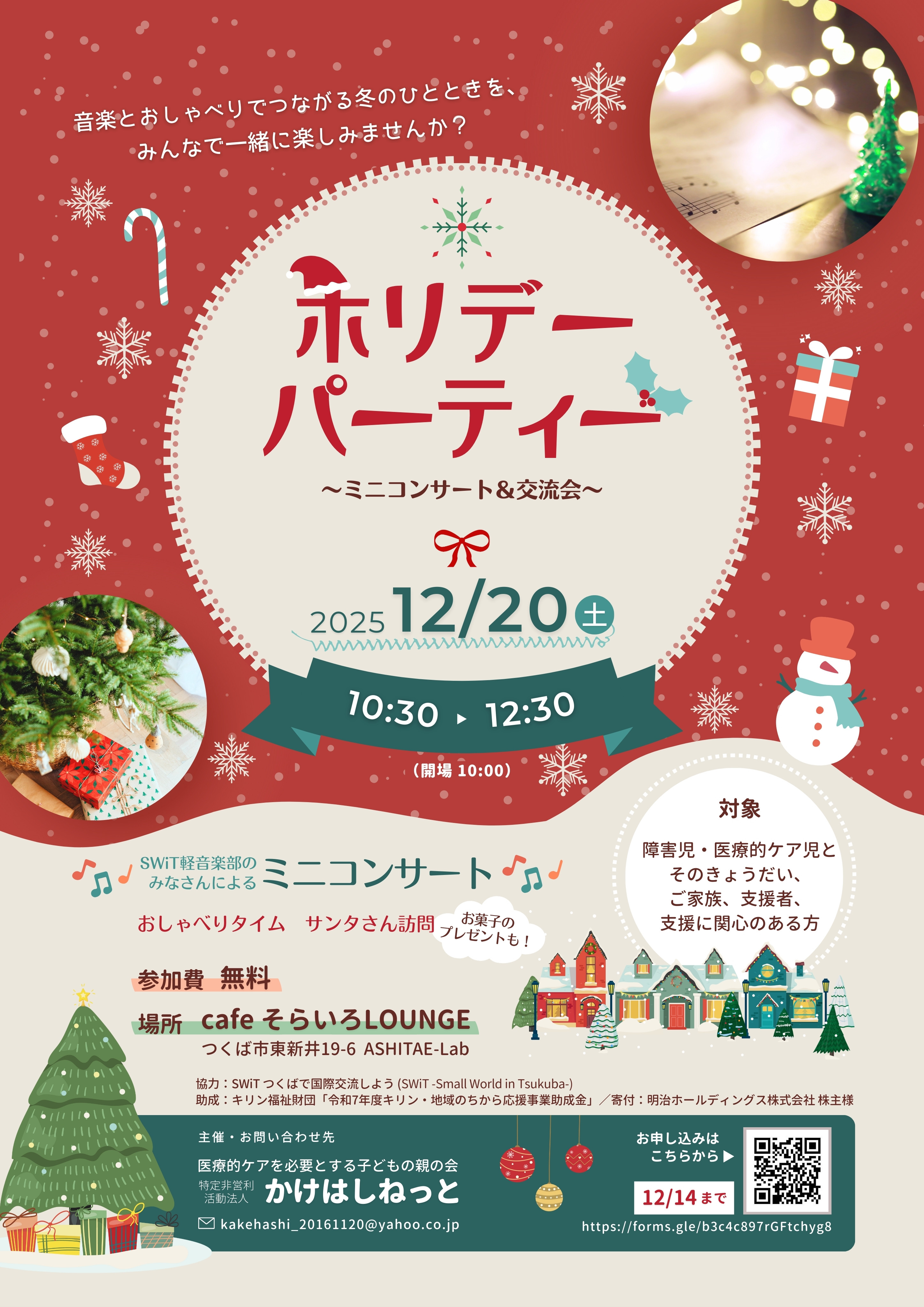 SWiT(つくばで国際交流しよう-Small World in Tsukuba-)軽音楽部のみなさんによるミニコンサートと、サンタさんがお菓子のプレゼントを持って来てくれる予定です。
